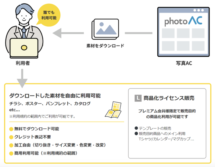 投稿者(クリエイター)がサイト上に投稿した写真素材を、利用者(ユーザー)はダウンロードすることができ、その素材をWEBサイトや印刷物に利用できるというサービスです。