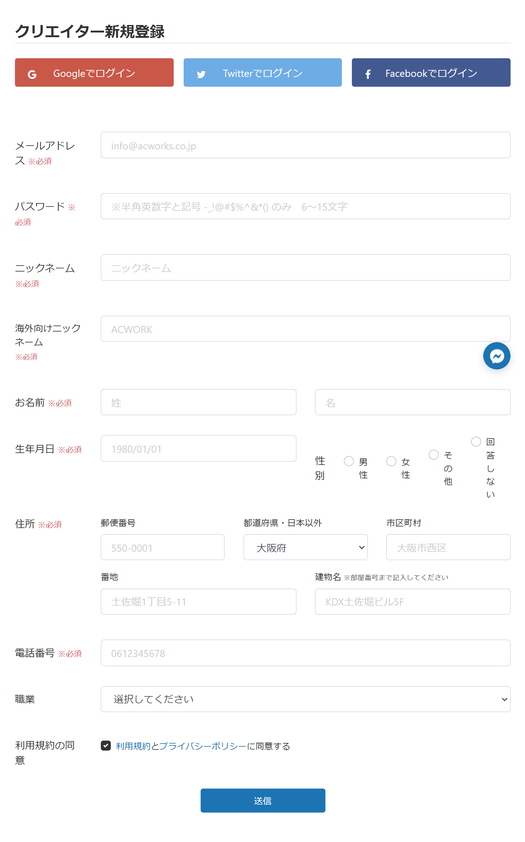 登録方法はとても簡単で、以下項目をフォームに入力し送信するだけです。