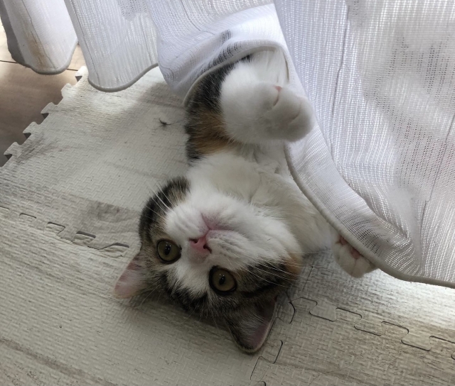 >>写真ACプロフィールページへタイトル「カーテンから顔を出す猫」