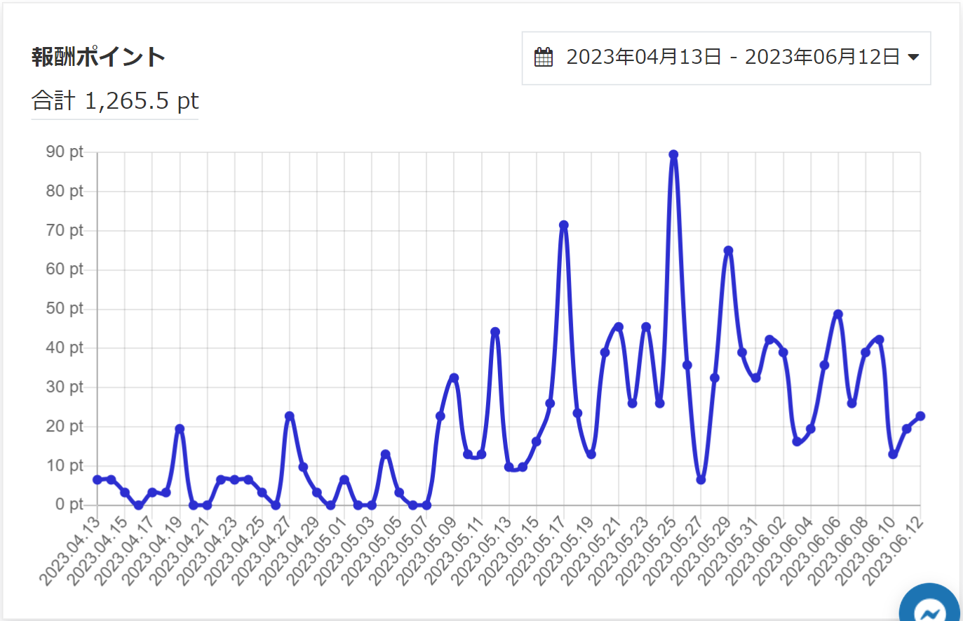5月初旬までは変わらず1日10Pt前後でしたが、5月の中旬より40~70Ptという日が出てきました。
