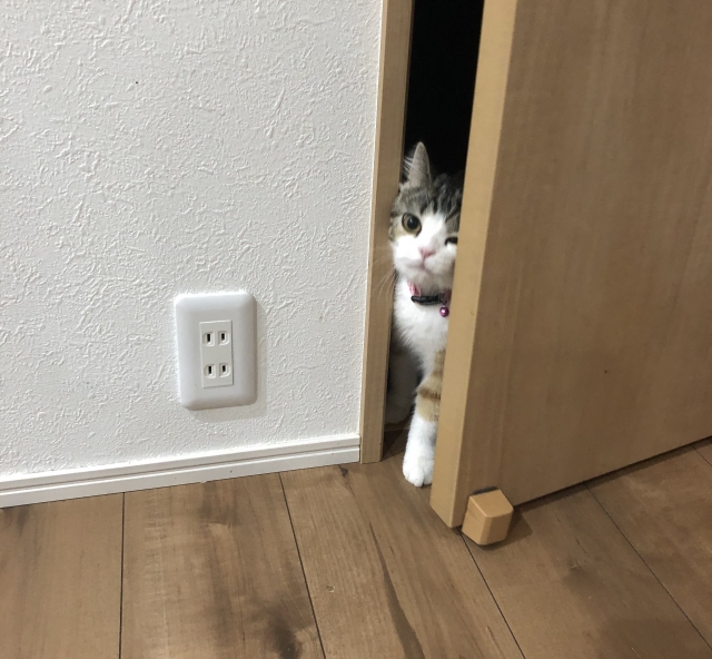 タイトル「ドアの隙間から顔をだす猫」