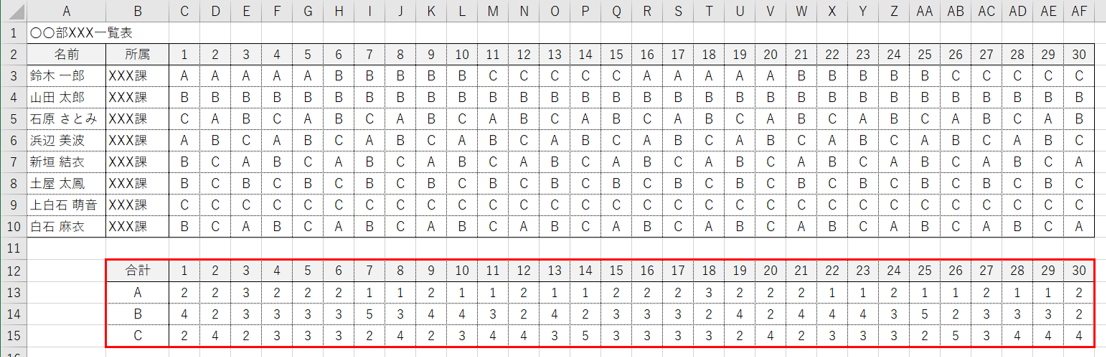例として、以下のような上部には従業員別の数値等の一覧、下部に合計が集計(赤枠で囲った範囲)された表があるとします。