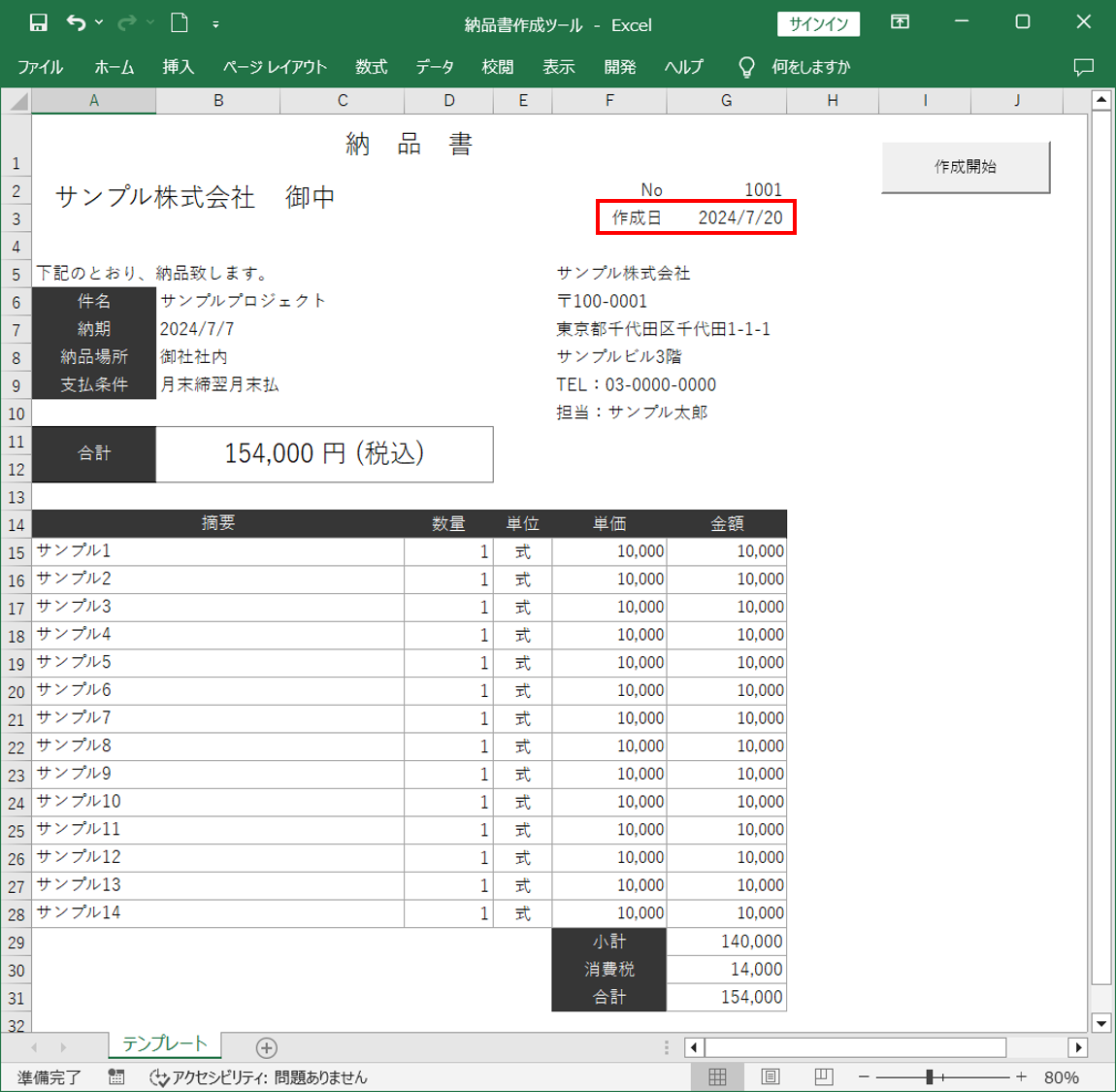 - テンプレートに各情報を入力しマクロ実行すると、入力された日付を取得(画像では作成日の2024/7/20)し、取得した日付から何月か判断。
