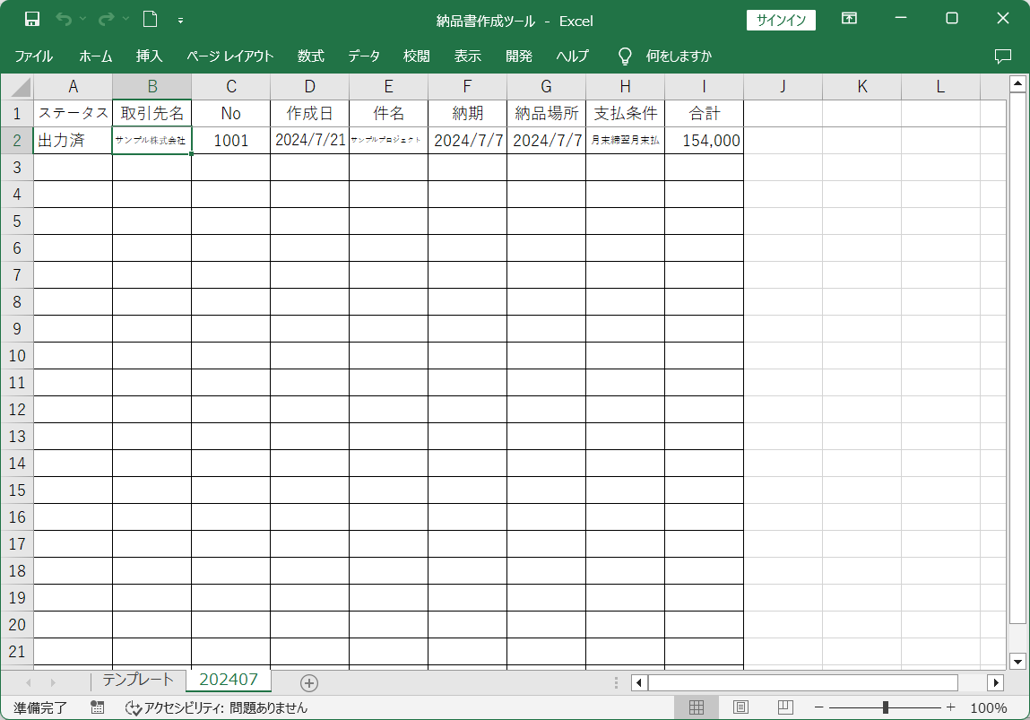 ③テンプレートシートを新規ブックにコピーし、 ファイル名「作成日+NO+取引先名」として、直下の納品書格納フォルダに保存します。