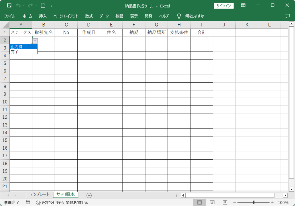 - 管理用としてステータス行を追加。ステータスの内容は入力規則で設定しておく。