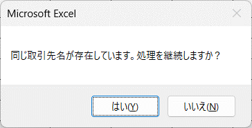 If MsgBox("同じ取引先名が存在しています。処理を継続しますか?", vbYesNo) = vbNo Then