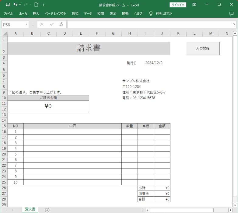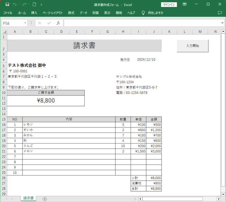 今回は例として、以下のような請求書を作成するフォーマットがあるとして、取引先名や住所、商品名など、可変部分をフォームで入力するようにしてみたいと思います。