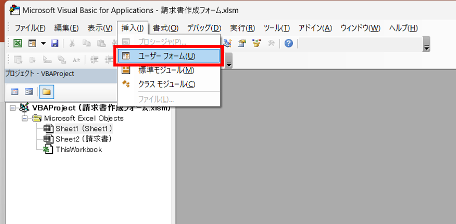 ①VBEを開き、挿入→ユーザーフォームを選択。