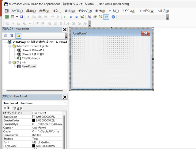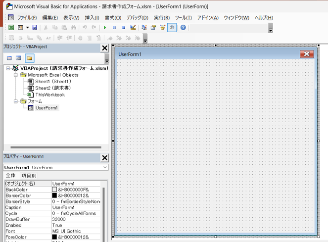 ②ユーザーフォームが挿入されます。台紙みたいなものと思ってください。