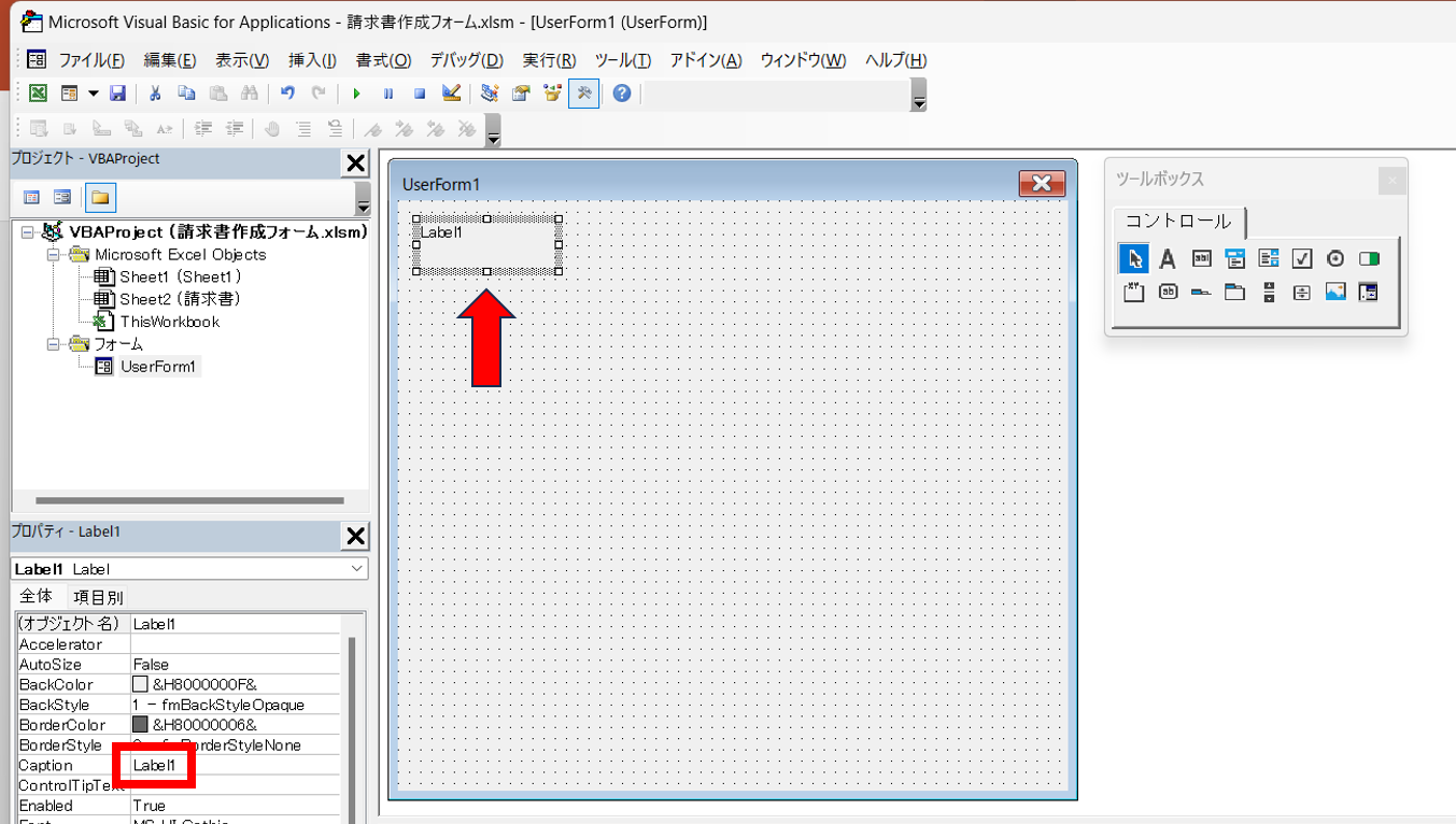 項目名はプロパティのcaptionで、「Label〇」の部分を変更することで、任意の項目名へ変更が可能です。