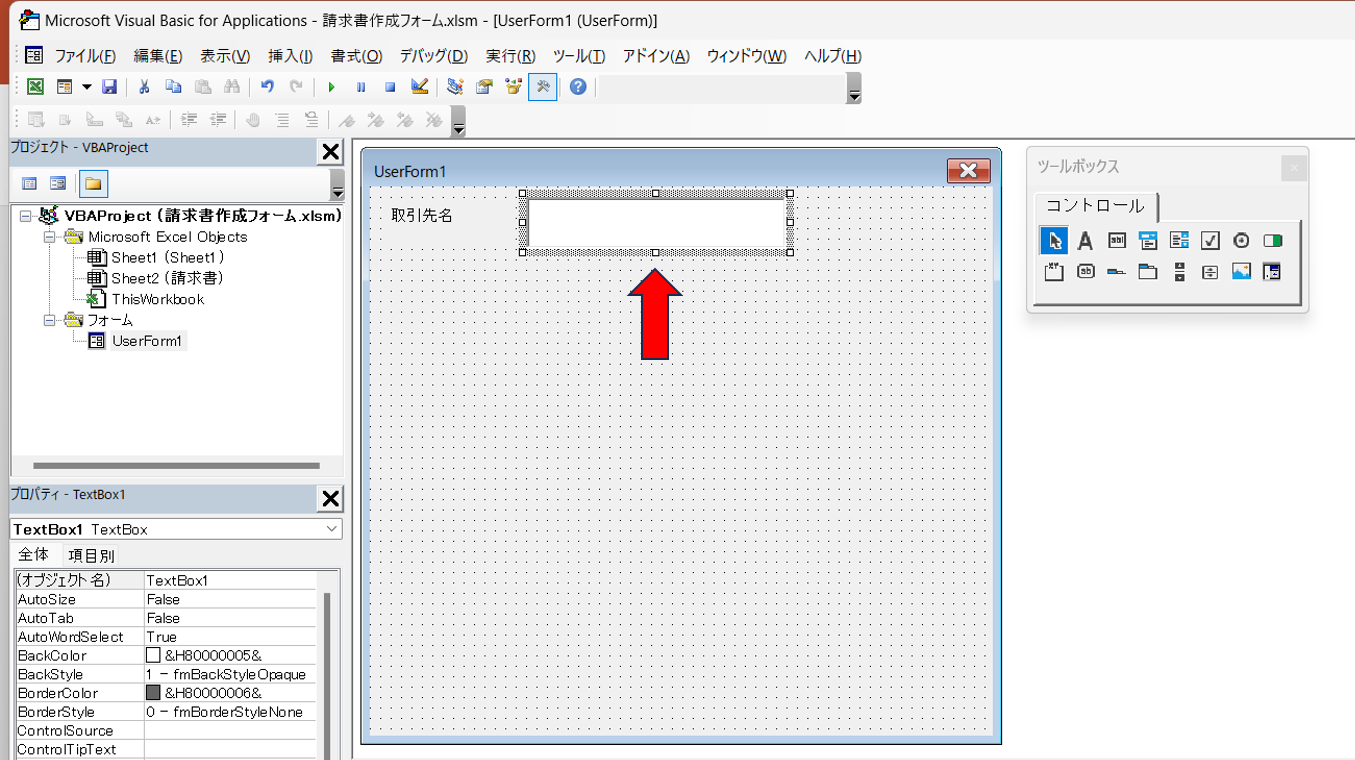 ⑧値を入力するボックスを作成するため、ツールボックスからテキストボックスを選択。