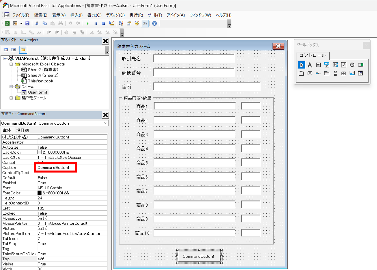 フォームが完成したら、次にコマンドボタンを押した時の挙動をコードで書いていきます。