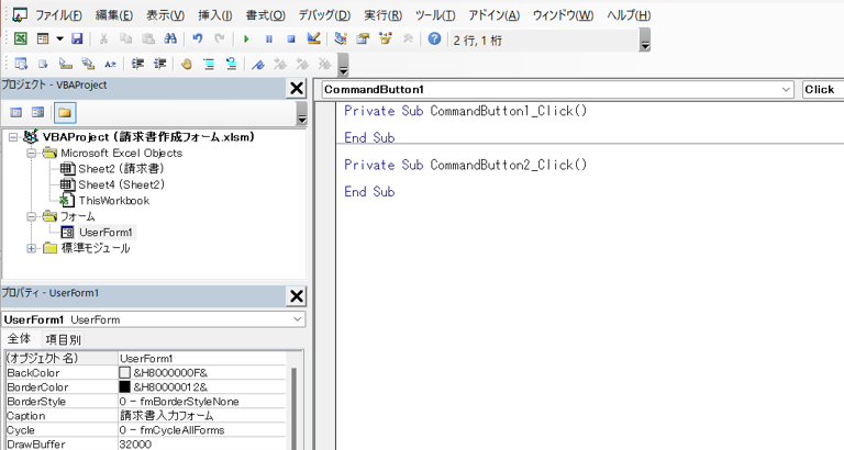 ここでは「CommandButton1_Click」がキャンセルボタン、「CommandButton2_Click」が登録ボタンを押した際の挙動になります。