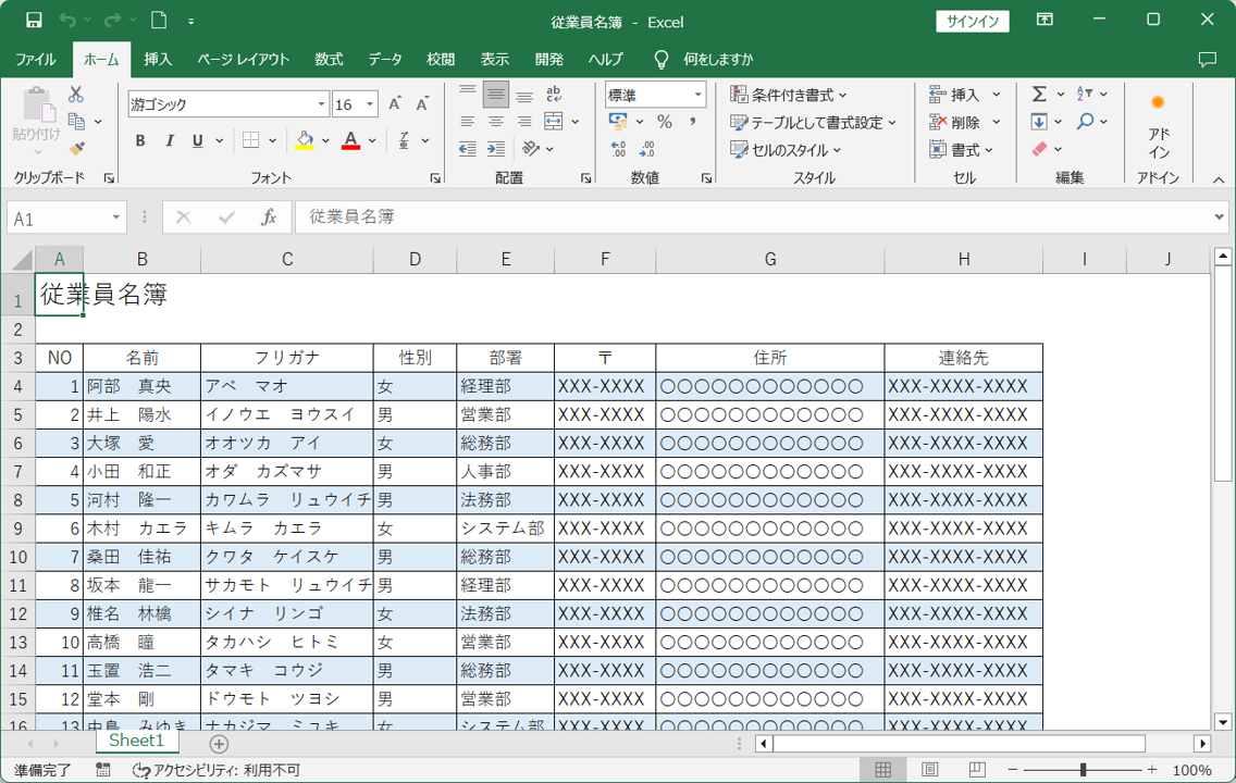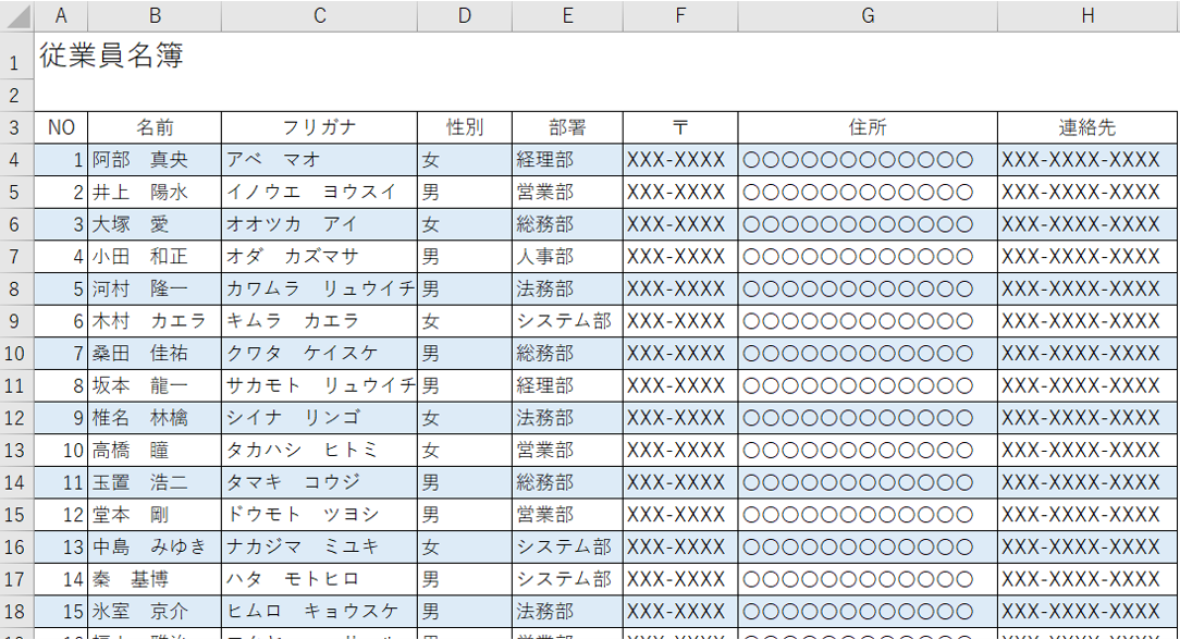 以下のExcelで作成された従業員名簿を例として説明したいと思います。