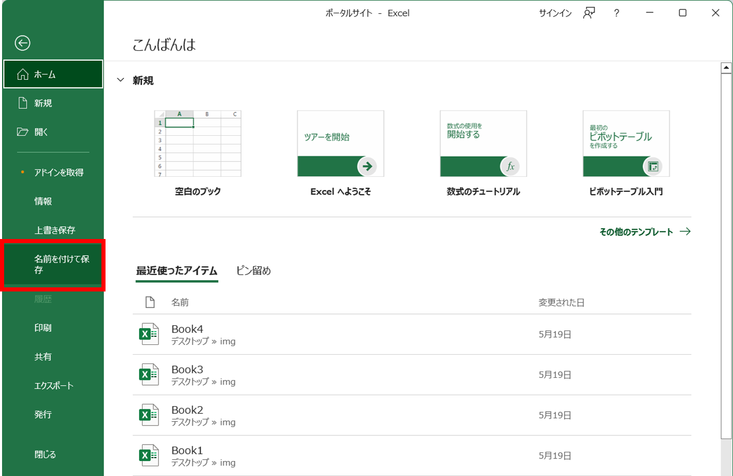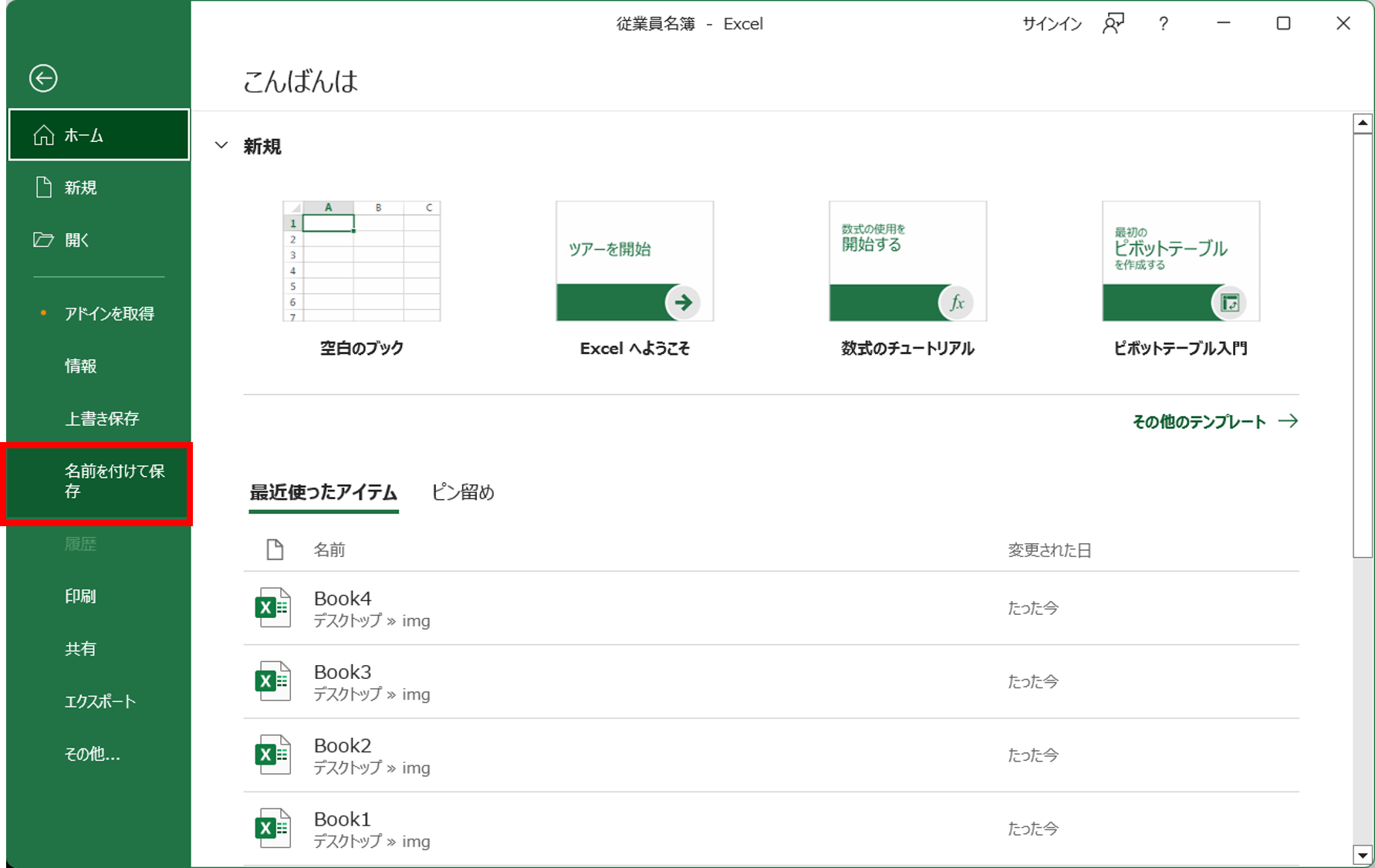 Excelファイルを開いたまま、上部「ファイル」から「名前を付けて保存」を選択します。