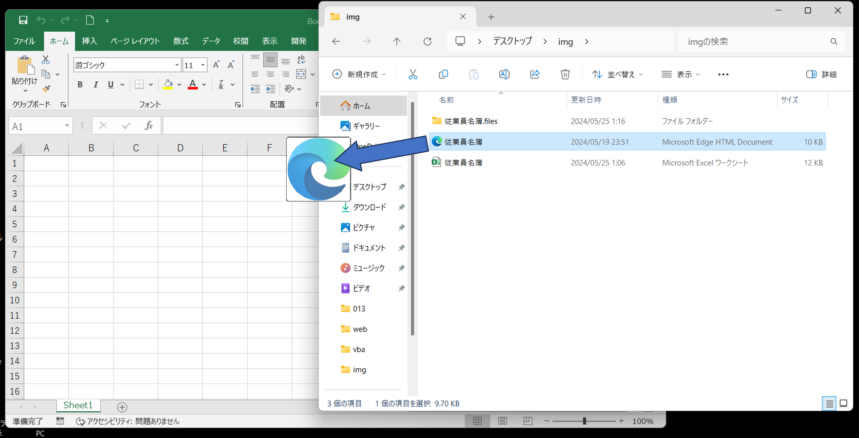 他にも簡単な開き方として、なんでもいいのでExcelブックを開き、htmファイルをExcel上にドラッグし開いてもExcelで開けます。