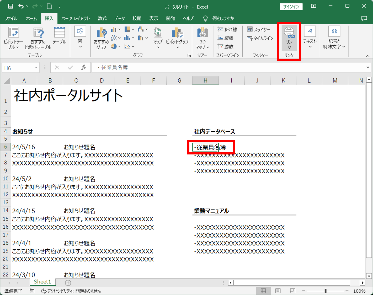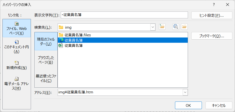 今回は例として、先ほど作成した従業員名簿をリンク先として貼ってみます。