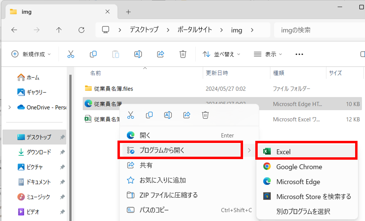 htmファイルのうえで右クリック→プログラムから開く→Excelを選択します。