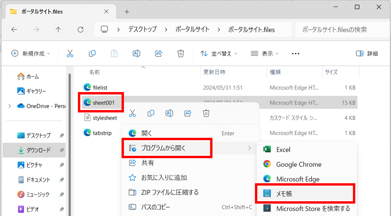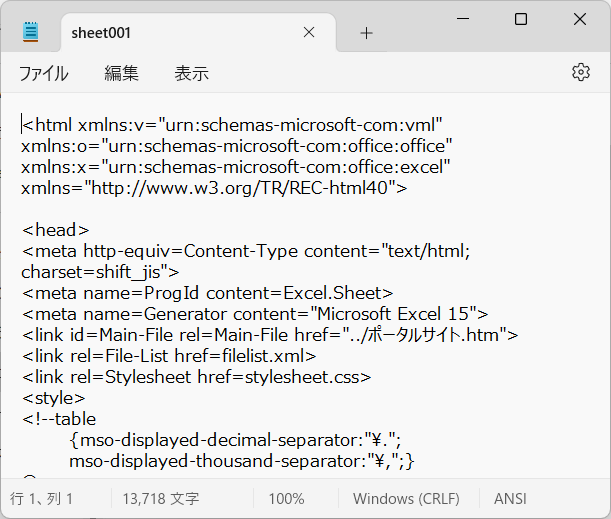 Excelのシート別にファイルが作成されるため、該当のシートファイルをメモ帳として開きます。