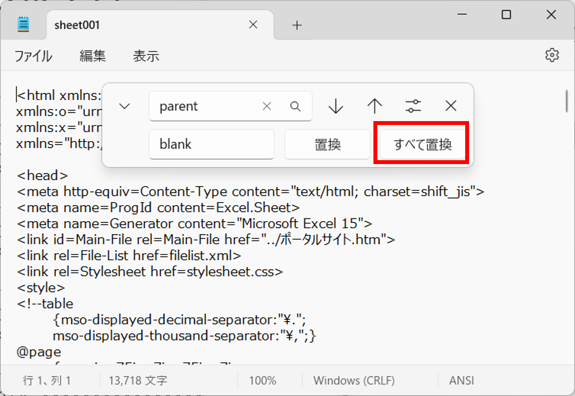 メモ帳を開いた状態でCtrl+Hをクリック→上段に「parent」・下段に「blank」と入力し、すべて置換をクリック→上書き保存。