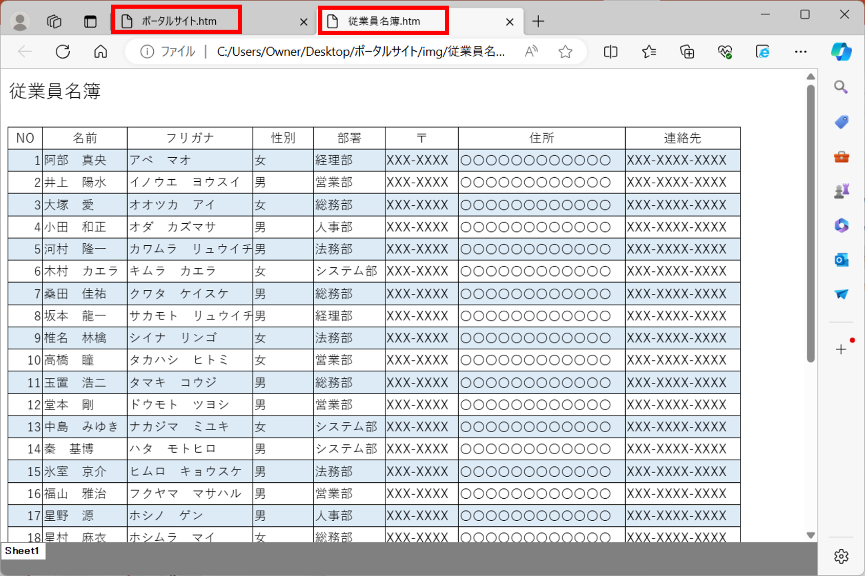 これがExcelで作ったファイルをhtmlとして表示した状態です。